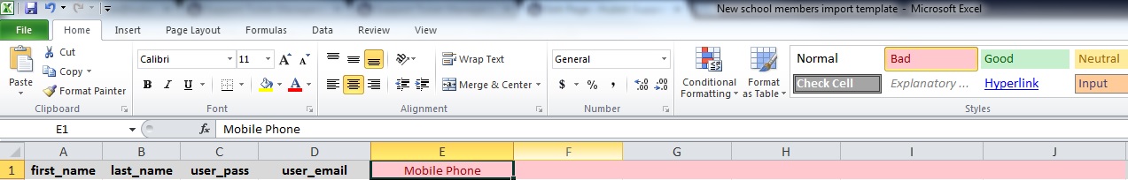 Any additional information can be created using Custom Fields and added on the right of those first four fields (the columns with the red background). For example, if you want to include cell phone numbers, create a column to the right of user_email labeled Mobile Phone.